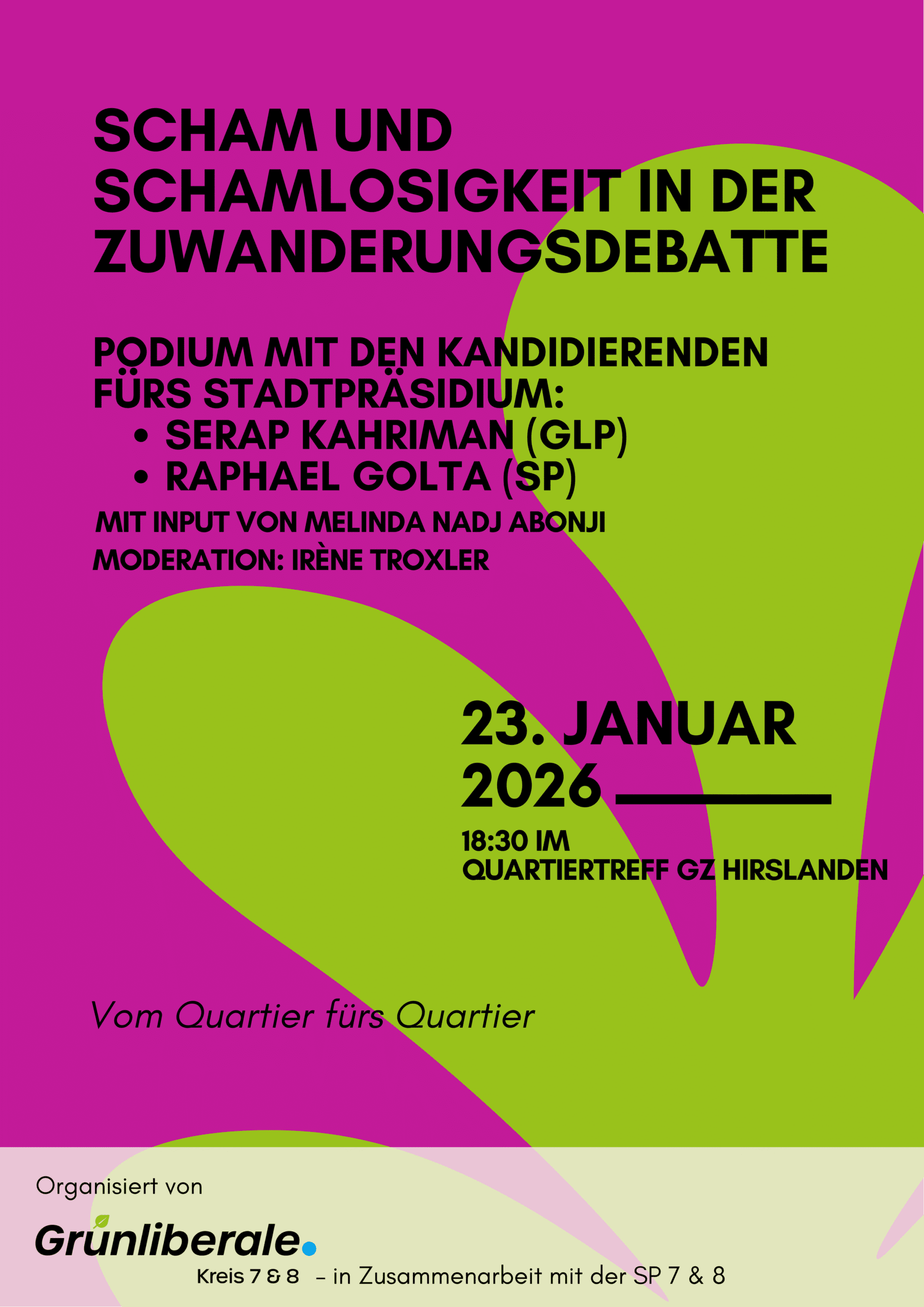 Podium mit den Stadtpräsidiumskandidierenden Serap Kahriman (GLP) und Raphael Golta (SP), mit einem Input der Schriftstellerin Melinda Nadj Abonji; Moderation: Irène Troxler (ehem. Leiterin NZZ-Ressort Zürich, Kommunikationsspezialistin AOZ).